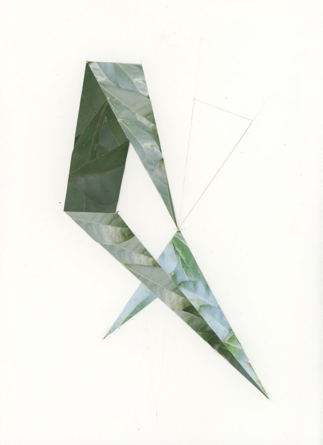 -- EVER GREEN These collages, like "Cutting Out The Snow" were a reaction against the ever more illustrative bent arising in my work. In order to go back to considering the relationship between form and content, I decided to use photographs of leaves as a sort of brushstroke. Rather than brushing onto "grids" (whether these grids were made of architectural elements, wallpaper patterns or drawings of animals) I used a set of strokes to create geometric forms. Again, the tension between planned and organic was present, but in an inverted way. The plant that I used for these collages was the English Laurel. I photographed the bush at various times of day, so as to capture the light in different ways. I then isolated individual leaves in photoshop, printed these leaves and cut them out. These were the raw material for collages. The English Laurel is a bush that is often pruned into architectural and geometric forms. It is an evergreen that forms a stable foundation for English garden design. -- |