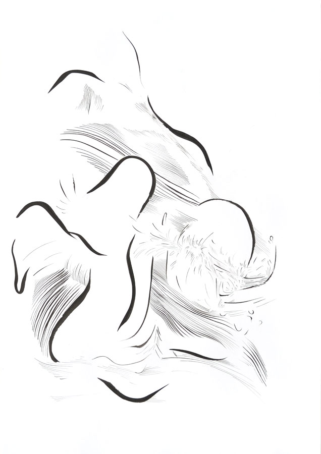 -- SERIES ONE These drawings are loosely based on classical and mannerist sculpture. I see a sculpture that I find strange, anachronistic, incomprehensible, whatever, and I loosely mimic it's gesture on paper. I then lay the drawing aside and only return to it, once the lines have become foreign to me. I draw into it, and keep repeating the process until I feel it is finished. This sampling has been heavily edited since I had over one hundred at first. The drawings that did not make the cut were literally cut up and rearranged into collages or else worked further into until a new series formed. I never throw anything away. Each failure is an opportunity for a new interpretation. -- |