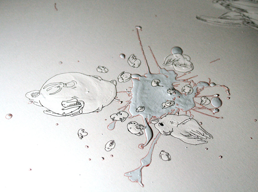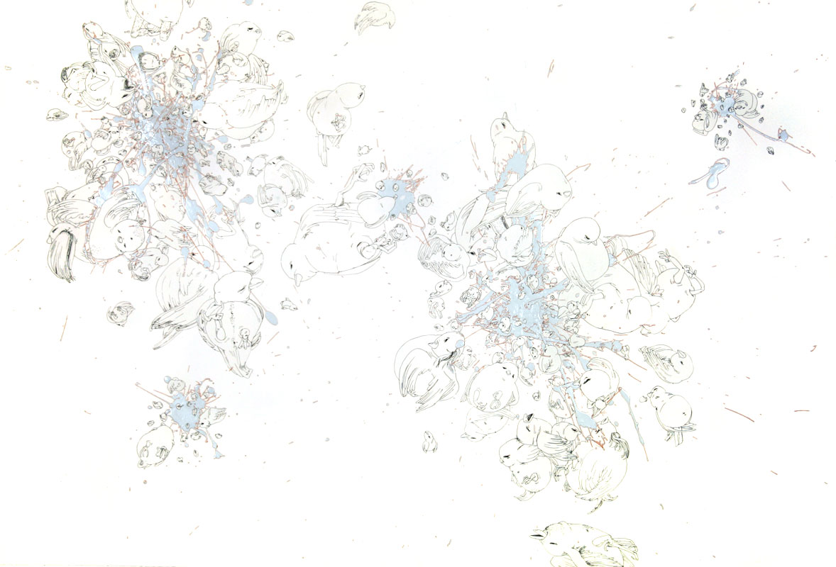 -- BIRDS The bird drawings are made through a process of directed apophenia. Paint is dripped into a piece of paper, allowed to dry, pucker, crack, and then I proceed to find as many birds in the resulting splatters as I can. At the time I was reading Witold Gombrowicz's Kosmos and the figure of the bird hung by its neck on a tree branch stuck with me. Additionally, the splatters of paint made me think of bird shit, so I went with it. -- |