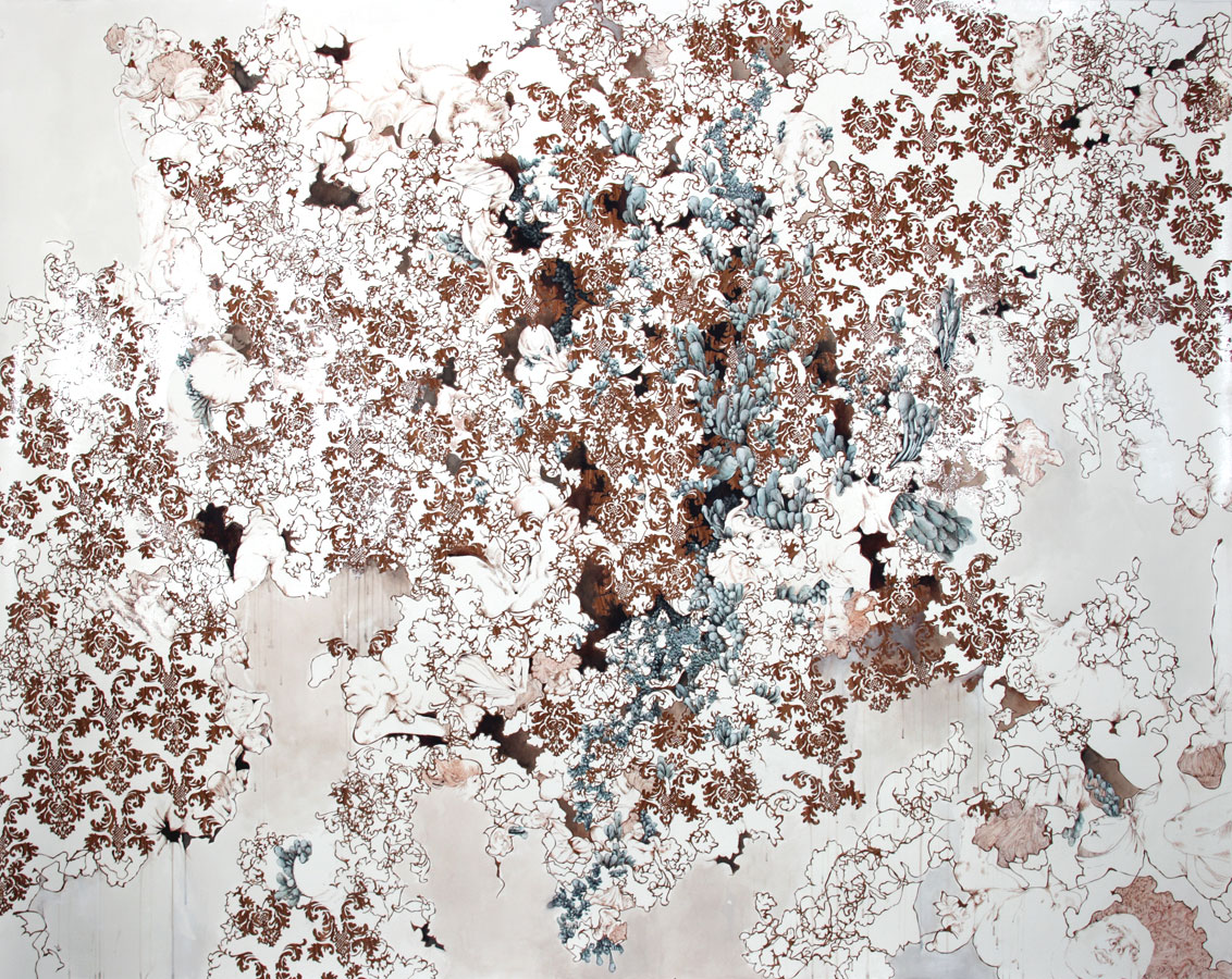 -- WALLPAPER DRAWINGS During my MFA I became interested in wallpaper as a substructure for my drawings, because it is a strange in-between space that can make rooms feel claustrophobic, rich or impoverished. I was using wallpaper designs similar to what I found in my old family photos from Poland. On a photograph of an Eastern European home, the wallpaper looks back-dated and poor, drawn onto paper it becomes baroque. After drawing a wallpaper "grid," I started pouring, brushing and splattering paint atop it. I would later trace this paint, weaving it in and out of the underlying pattern and layering until the work felt finished. The weaving into an underlying pattern, as well as the strategy of pareidolia, gave me permission to create certain types of images that might be seen as illustrative, low-brow or stylized. For me, it was a means of adapting the different, fluid aspects of what I suppose we'd call my identity: Polish immigrant, Canadian, working-class, lack of belonging. -- |
